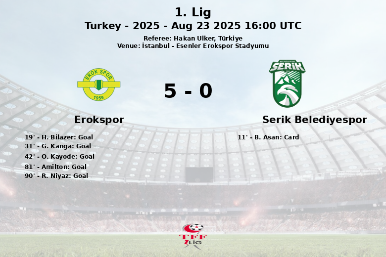 Le match s’est transformé en une bataille difficile pour Serik Belediyespor dès la 11e minute, lorsque B. Asan a reçu un carton rouge, laissant son équipe à dix. Erokspor a profité de l’avantage numérique et H. Bilazer a ouvert le score à la 19e minute, sur une passe de M. Okyar. La pression constante d’Erokspor a de nouveau porté ses fruits à la 31e minute, avec un but sur penalty transformé par G. Kanga. Avant la mi-temps, O. Kayode a creusé l’écart à la 42e minute, grâce à une passe décisive de G. Kanga, scellant une première mi-temps dévastatrice pour Serik Belediyespor.