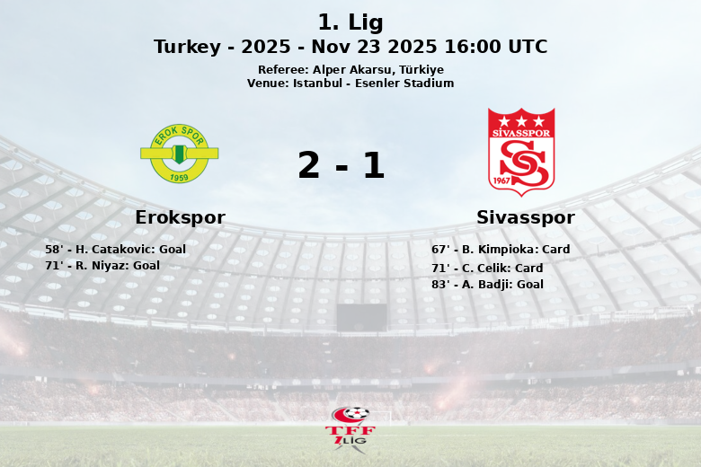 Istanbul, Turquie – Dans un match palpitant qui s’est déroulé au stade Esenler d’Istanbul, Erokspor a vaincu Sivasspor lors d’un match correspondant à la 14e journée de la 1. Lig turque. Le match, arbitré par Alper Akarsu, s’est déroulé dans une atmosphère de grande intensité et d’excitation.
