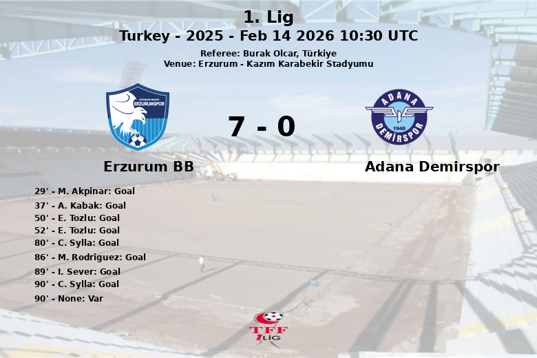 M. Akpinar a ouvert le score à la 29e minute, suivi par A. Kabak à la 37e. Erzurum BB a continué son siège en seconde période, avec E. Tozlu marquant sur penalty à la 52e minute, après en avoir raté un précédemment à la 50e. C. Sylla (80e et 90e minutes), M. Rodriguez (86e minute) et I. Sever (89e minute) se sont également joints à la fête des buts. Un but de C. Sylla à la 90e minute a été refusé après vérification du VAR.