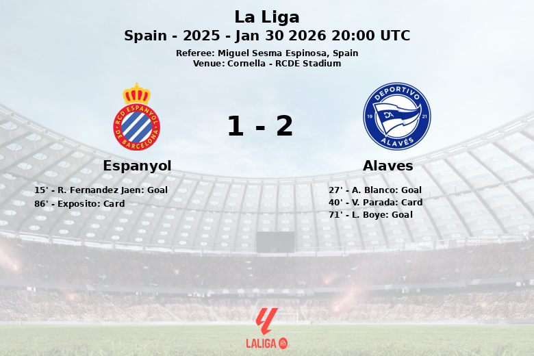 Dans un match disputé au stade RCDE de Cornellà, Alavés a remporté la victoire contre l’Espanyol lors d’un match correspondant à la 22e journée de Liga. Le match, arbitré par Miguel Sesma Espinosa, a été marqué par l’intensité et les changements de leader.