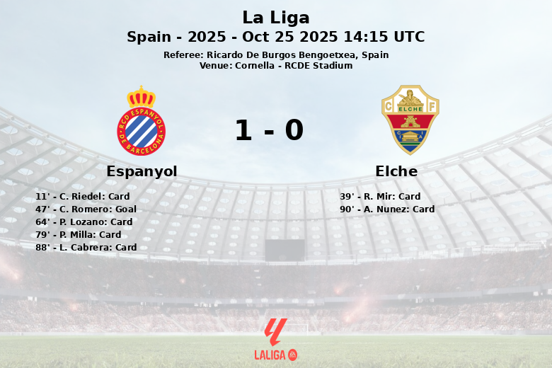 Le match a été marqué par l’intensité et la bataille au milieu de terrain. L’arbitre Ricardo De Burgos Bengoetxea a distribué un total de six cartons jaunes aux joueurs de l’Espanyol (C. Riedel, P. Lozano, P. Milla, L. Cabrera) et deux aux joueurs d’Elche (R. Mir, A. Nunez).