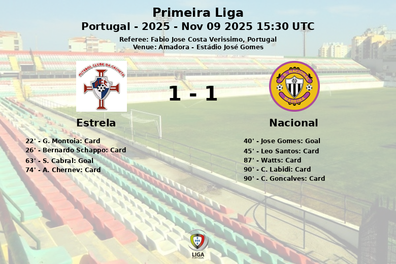 Nacional a pris l’avantage à la 40e minute avec un but de Jose Gomes, sur une passe décisive de Liziero. Cependant, Estrela a égalisé à la 63e minute grâce à un penalty transformé par S. Cabral.