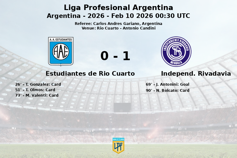 Rio Cuarto, Argentine – Dans un match marqué par l’intensité et les batailles au milieu de terrain, Independiente Rivadavia a remporté une victoire étriquée contre Estudiantes de Rio Cuarto au stade Antonio Candini. Le match, valable pour la quatrième journée de la Liga Profesional Argentina 2026, s’est décidé sur un but contre son camp de J. Antonini à la 69e minute, après un centre qui a posé des problèmes à la défense locale.
