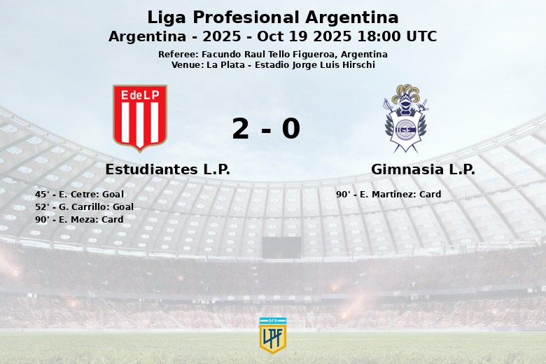 Le premier but est arrivé juste avant la mi-temps, avec E. Cetre, servi par S. Ascacibar, qui a débloqué la situation pour Estudiantes. En seconde période, G. Carrillo a accru l’avantage des locaux, consolidant ainsi leur domination.