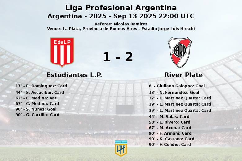 La Plata, Province de Buenos Aires – Dans un match rempli d’émotions et de controverses au stade Jorge Luis Hirschi, River Plate a obtenu une victoire difficile 2 à 1 contre Estudiantes de La Plata, lors de la 8ème journée de la Ligue Professionnelle Argentine 2025.