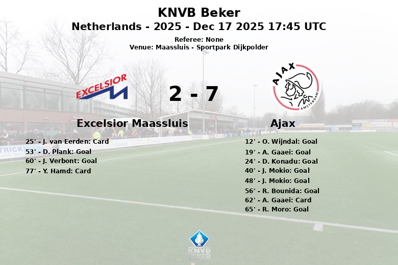 Malgré la domination de l’Ajax, Excelsior Maassluis a tenté de se battre, bien qu’avec moins de ressources. D. Plank a réussi à marquer pour l’équipe locale à la 53e minute, assisté par J. Verbont, et plus tard, J. Verbont a de nouveau marqué à la 60e minute, assisté par M. Bakour. Cependant, la réponse de l’Ajax a été énergique, avec des buts de J. Mokio à la 48e minute, R. Bounida à la 56e minute et R. Moro à la 65e minute.