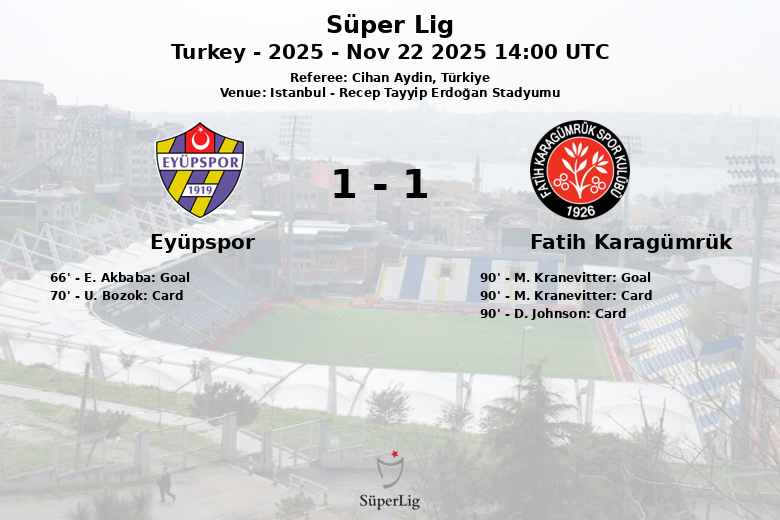 Remplacements dans l’quipe de eyüpspor: À la 65e minute, Lucas Calegari est entré et D. Dragus est sorti., À la 76e minute, U. Bozok est entré et P. O. Ampem est sorti., À la 76e minute, E. Akbaba est entré et Y. Kayan est sorti.