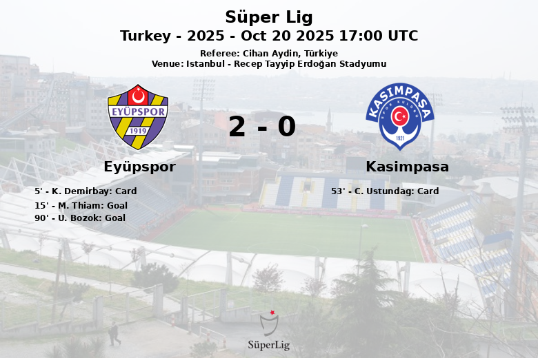 Dans les dernières minutes, Eyüpspor a scellé sa victoire avec un but de U. Bozok à la 90e minute, assisté par S. Seslar. Bien que le match ait été marqué par quelques fautes et cartons jaunes (un pour chaque équipe), la supériorité d’Eyüpspor sur le terrain était évidente, reflétée dans leurs 16 tirs, dont 9 cadrés. Le match s’est conclu par une nette victoire de l’équipe locale lors de la neuvième journée de la Süper Lig.