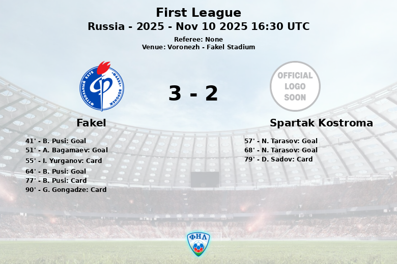 Fakel a ouvert le score à la 41e minute avec un but de B. Pusi, donnant à son équipe une avance initiale. À la 51e minute, A. Bagamaev a creusé l’écart, portant le score à 2-0. Cependant, Spartak Kostroma n’a pas abandonné et N. Tarasov a marqué à la 57e minute, donnant de l’espoir aux visiteurs.