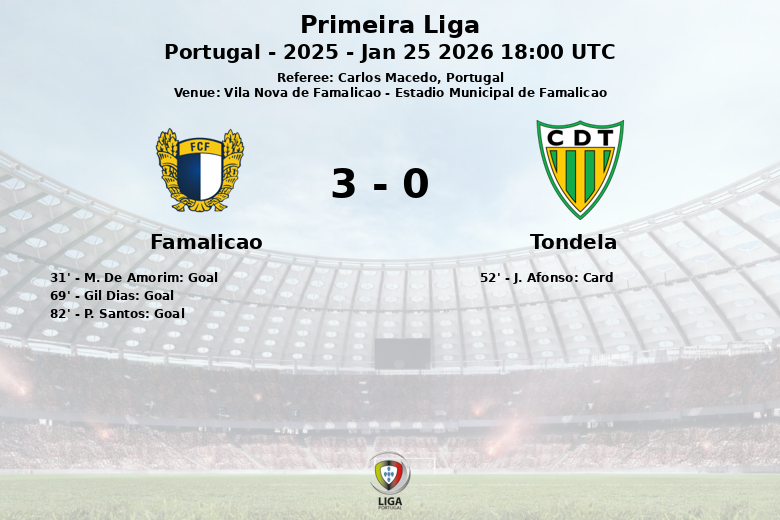 Vila Nova de Famalicao, Portugal – Dans un match qui s’est déroulé à l’Estadio Municipal de Famalicao, Famalicao a remporté une nette victoire sur Tondela, grâce à une solide possession de balle de 62%. Le score a été ouvert à la 31e minute avec un but de M. De Amorim, sur une passe décisive de S. Elisor. En seconde période, Gil Dias a creusé l’écart pour Famalicao à la 69e minute. P. Santos a scellé la victoire avec un troisième but à la 82e minute.