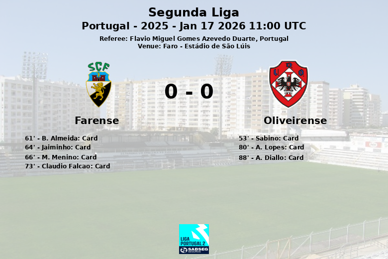 Le match, correspondant à la 18e journée de la Segunda Liga portugaise, saison 2025, a vu les deux équipes se battre au milieu de terrain. Malgré la forte tension, aucune des deux équipes n’a réussi à débloquer le score. Farense a terminé le match avec 3 cartons jaunes, tandis qu’Oliveirense a également reçu 3 avertissements.
