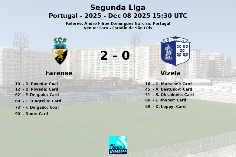 Farense a pris l’avantage dès le début grâce à un but de D. Poveda à la 10e minute, sur une passe décisive de Derick Poloni. Cependant, Poveda a également reçu un carton jaune deux minutes plus tard. La première mi-temps s’est poursuivie avec un jeu disputé au milieu de terrain, avec un carton jaune pour H. Morschel de Vizela à la 16e minute et un autre pour A. Bastunov juste avant la mi-temps.