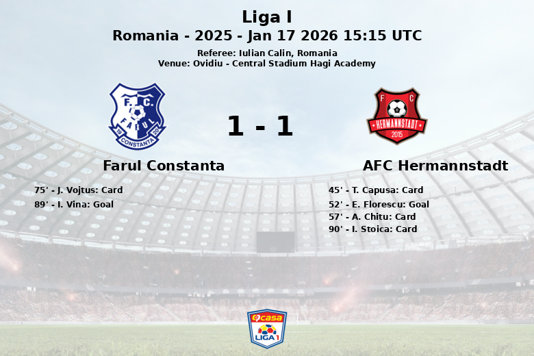 Malgré leur avantage territorial, Farul Constanta a rencontré une équipe d’Hermannstadt bien organisée. Le premier but du match est arrivé à la 52e minute, grâce à E. Florescu pour Hermannstadt, leur donnant l’avantage. Cependant, la persévérance de Farul Constanta a porté ses fruits à la 89e minute lorsque I. Vina a égalisé, laissant le score final à égalité.
