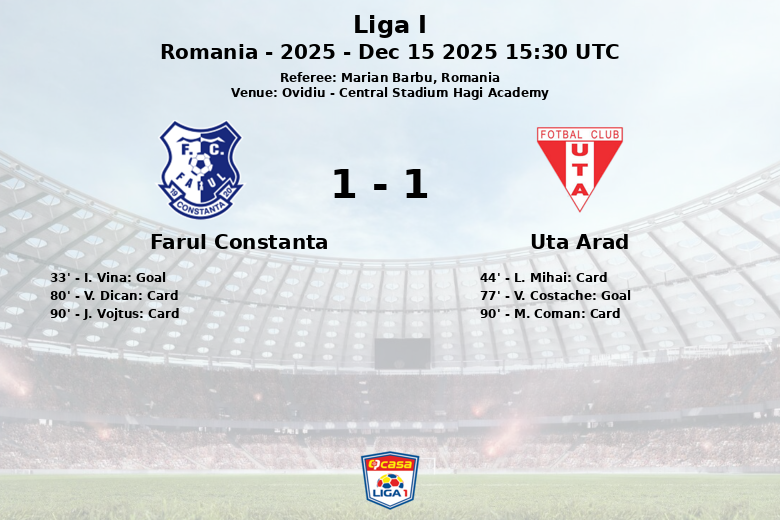 Ovidiu, Roumanie – Un match disputé entre Farul Constanta et Uta Arad s’est terminé par un match nul au Central Stadium Hagi Academy le 15 décembre 2025. La rencontre, correspondant à la 20e journée de Liga I, a été marquée par l’intensité et les occasions aux deux bouts du terrain.