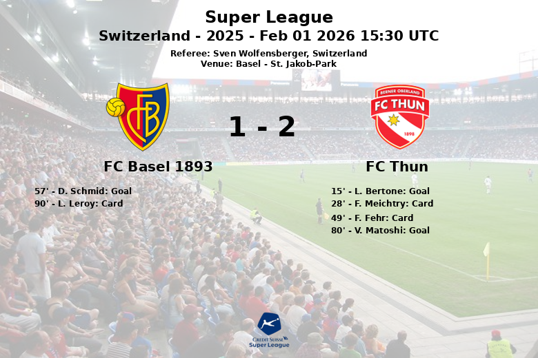 Bâle, Suisse – Un match passionnant s’est déroulé au St. Jakob-Park ce samedi, où le FC Bâle 1893 et le FC Thoune ont fait match nul deux buts partout lors d’une rencontre comptant pour la 22e journée de la Super League suisse.