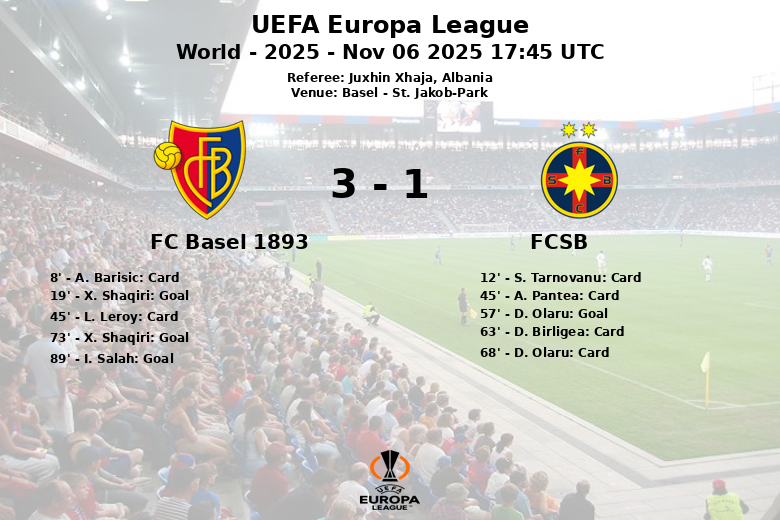 Lors d’un match disputé au St. Jakob-Park à Bâle, le FC Bâle 1893 s’est imposé 3 à 1 face au FCSB lors de la quatrième journée de la phase de groupes de l’UEFA Ligue Europa. Le match, arbitré par l’Albanais Juxhin Xhaja, a été marqué par l’intensité et de nombreux cartons.