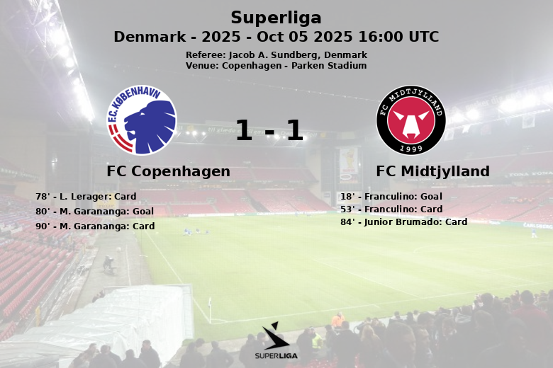 Copenhague, Danemark – Lors d’un match de la Superliga danoise disputé au Parken Stadium, le FC Copenhague et le FC Midtjylland ont fait match nul dans une rencontre tendue et riche en rebondissements. Le FC Midtjylland a pris l’avantage grâce à un but de Franculino à la 18e minute, sur une passe décisive de P. Billing. Le FC Copenhague, dominant la possession du ballon avec 61%, a cherché avec insistance l’égalisation. Finalement, M. Garananga a réussi à égaliser à la 80e minute, sur une passe décisive de J. Larsson, déclenchant la joie des supporters locaux. Le match a été marqué par l’intensité, reflétée par les cartons jaunes distribués aux deux équipes et le carton rouge infligé à M. Garananga en fin de rencontre. Sur le plan statistique, le FC Copenhague a dépassé son rival en nombre total de tirs (16 contre 10) et de corners (7 contre 2), bien que l’efficacité des deux équipes devant le but ait été similaire, avec trois tirs cadrés pour chacune. Le match, arbitré par Jacob A. Sundberg, s’est terminé par un match nul qui a laissé un goût mitigé aux deux équipes.