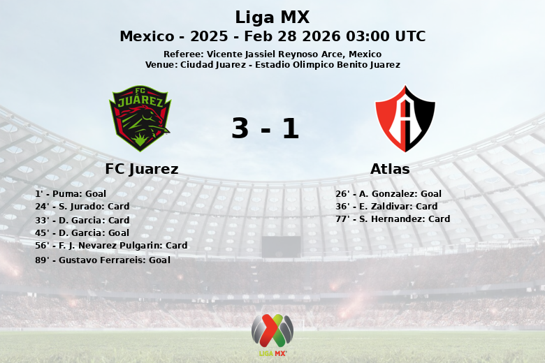 Ciudad Juárez, Mexique – Dans un match vibrant et disputé à l’Estadio Olímpico Benito Juárez, le FC Juárez a battu Atlas avec un score final de 3-1 lors de la huitième journée du tournoi Clausura 2025 de la Liga MX. Le match, joué le 28 février 2026, a été caractérisé par l’intensité et l’action constante devant les deux buts.