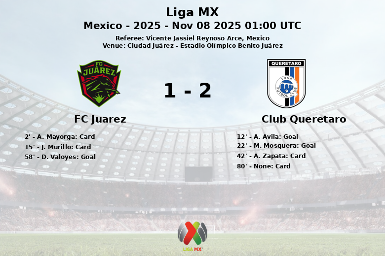 Ciudad Juárez, Mexique – Dans un match acharné au Stade Olímpico Benito Juárez, le FC Juárez et le Club Querétaro ont fait match nul dans un match plein d’émotions du début à la fin. Querétaro a pris une avance rapide avec un but de A. Avila à la 12e minute, sur une passe de L. Rodriguez. L’avantage de Querétaro s’est accru à la 22e minute avec un but contre son camp de M. Mosquera. Malgré une possession de balle de 75 %, le FC Juárez s’est battu pour revenir dans le match. La persévérance de Juárez a porté ses fruits à la 58e minute lorsque D. Valoyes a marqué un but, sur une passe de R. Fulgencio. Le match s’est terminé sur le score de deux à un, reflétant l’intensité et les efforts des deux équipes. Le match a été marqué par un jeu intense au milieu de terrain, entraînant 9 fautes pour Juárez et 12 pour Querétaro. L’arbitre Vicente Jassiel Reynoso Arce a montré deux cartons jaunes à l’équipe locale et un aux visiteurs.