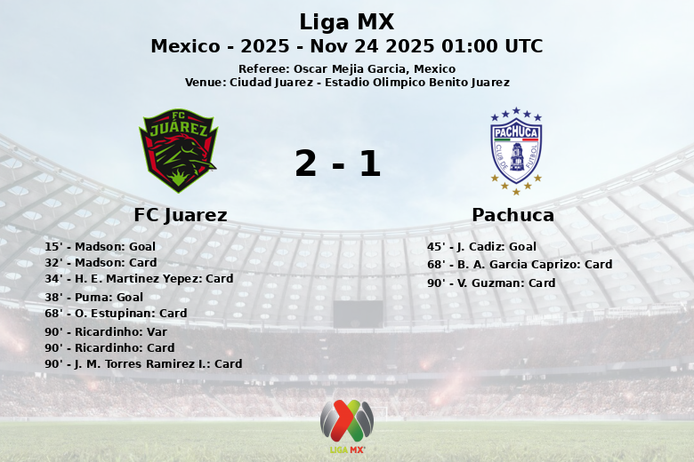 Dans le temps additionnel, un but de Ricardinho pour le FC Juárez a été refusé après examen du VAR. Pour couronner le tout, V. Guzman, de Pachuca, et J. M. Torres Ramirez I., du FC Juárez, ont reçu des cartons rouges, reflétant l’intensité du match.