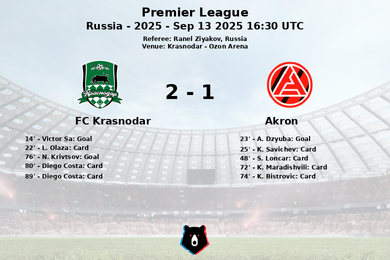 FC Krasnodar vs Akron Sep 13 2025 16:30 UTC