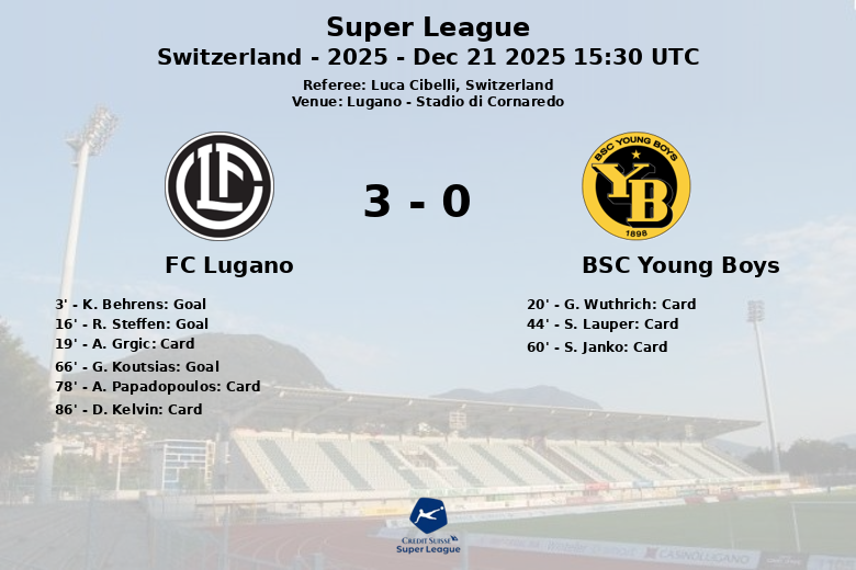 Lugano, Suisse – Le FC Lugano a remporté une victoire convaincante contre le BSC Young Boys lors d’un match disputé au Stadio di Cornaredo, comptant pour la 19e journée de la Super League. Dès le début, l’équipe locale a démontré sa supériorité, ouvrant le score à la 3e minute grâce à un but de K. Behrens, assisté par M. Zanotti. L’avance a été rapidement étendue avec un but de R. Steffen à la 16e minute, assisté par A. Grgic. Le match s’est tendu avec plusieurs cartons jaunes pour les deux équipes, dont un pour A. Grgic de Lugano et G. Wuthrich et S. Lauper de Young Boys. En deuxième mi-temps, G. Koutsias a scellé la victoire avec un but à la 66e minute, assisté par M. Marques. Le BSC Young Boys a subi un coup dur lorsqu’ils ont été réduits à dix après l’expulsion de S. Janko à la 60e minute. Malgré leur infériorité numérique, Young Boys n’a pas pu inverser la situation. Le FC Lugano a dominé la possession avec 57% et a pris 11 tirs, tandis que Young Boys avait 43% de possession et 8 tirs. L’arbitre Luca Cibelli a eu un après-midi chargé, distribuant plusieurs cartons.