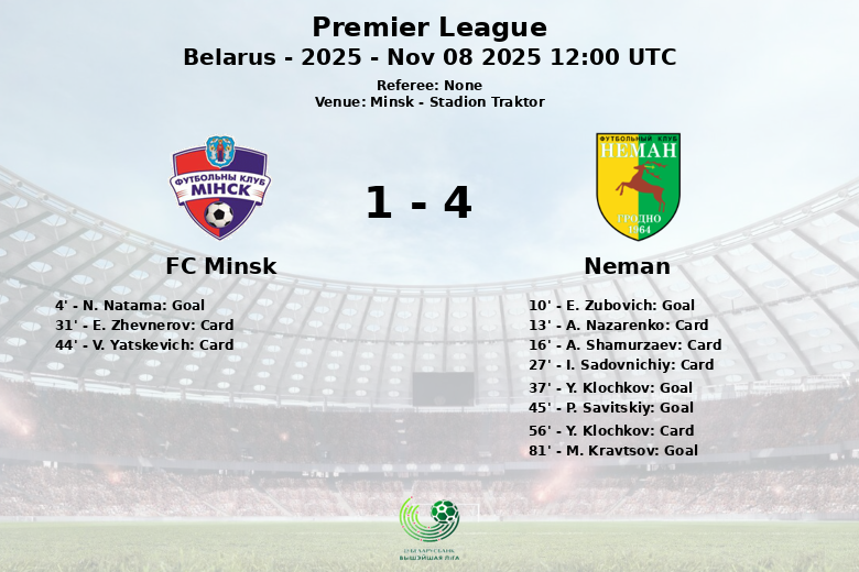 Dans un match disputé au Stadion Traktor de Minsk, Neman a démontré sa supériorité en battant le FC Minsk avec un score reflétant la disparité sur le terrain. Malgré un début prometteur pour l’équipe locale avec un but de N. Natama à la 4e minute, sur une passe décisive de I. Dubinets, Neman a rapidement réagi et pris le contrôle de la rencontre.