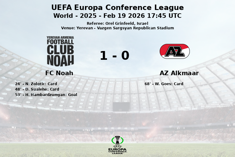YEREVAN, 19 février 2026 – Dans un match disputé au stade Républicain Vazgen Sargsyan de Yerevan, le FC Noah a décroché une victoire surprenante contre l’AZ Alkmaar lors du match aller des seizièmes de finale de l’UEFA Europa Conference League. Le but de H. Hambardzumyan à la 53e minute, sur une passe décisive de H. Ferreira, a suffi pour assurer la victoire à domicile.