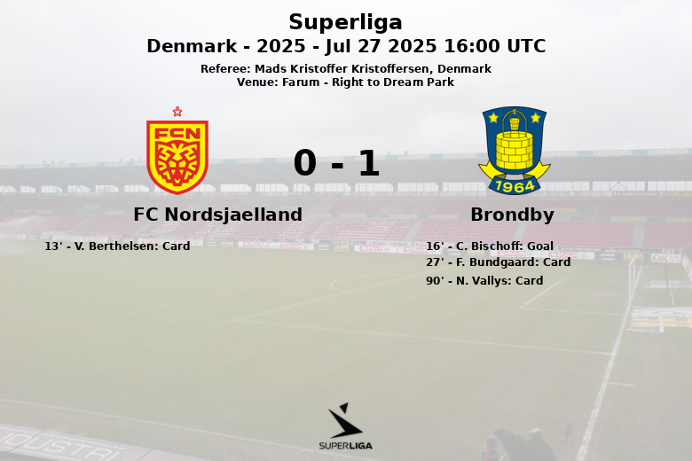 Brondby a ouvert le score tôt, à la 16e minute, grâce à un but de C. Bischoff sur une passe décisive de N. Vallys. Malgré la domination de la possession par le FC Nordsjaelland avec 55%, ils n’ont pas réussi à concrétiser leurs occasions, accumulant 15 tirs mais seulement 5 cadrés. Nordsjaelland a également eu plus de corners, avec 7, tandis que Brondby n’en a eu aucun.