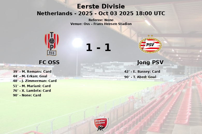 Oss, Pays-Bas – Dans un match disputé au Frans Heesen Stadion, le FC Oss et le Jong PSV ont fait match nul dans une rencontre qui, bien que peu spectaculaire, a été marquée par l’intensité et de nombreux avertissements.