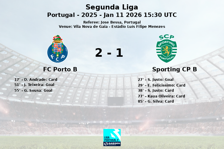 La deuxième mi-temps a été dominée par le FC Porto B, qui a réussi à renverser le score avec des buts de J. Teixeira à la 51e minute, sur une passe décisive de D. Rodrigues, et de G. Sousa à la 55e minute, également sur une passe décisive de D. Rodrigues. Le Sporting CP B a reçu deux cartons jaunes supplémentaires en deuxième mi-temps, pour Kaua Oliveira et G. Silva, reflétant la frustration de l’équipe. L’arbitre José Bessa a officié le match.