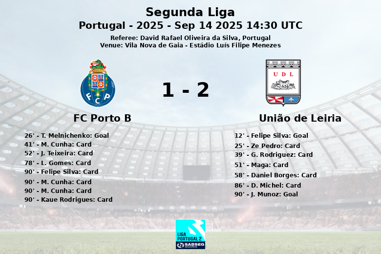 L’União de Leiria a pris l’avantage grâce à un but contre son camp de Felipe Silva à la 12e minute. Cependant, le FC Porto B a réagi rapidement, avec T. Melnichenko égalisant à la 26e minute. Le match est resté serré et disputé, avec des fautes constantes entraînant une pluie de cartons jaunes pour les deux équipes.