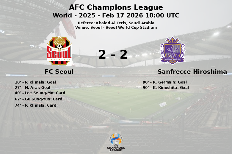 Séoul, Corée du Sud – Lors d’une rencontre palpitante disputée au Seoul World Cup Stadium, le FC Séoul et Sanfrecce Hiroshima ont fait match nul lors d’un match comptant pour la phase de groupes de la Ligue des Champions de l’AFC. L’équipe locale, le FC Séoul, a pris l’avantage dès le début avec un but sur penalty de P. Klimala à la 10e minute. L’avantage a été élargi grâce à un but contre son camp de N. Arai à la 27e minute, donnant à l’équipe coréenne un avantage confortable.