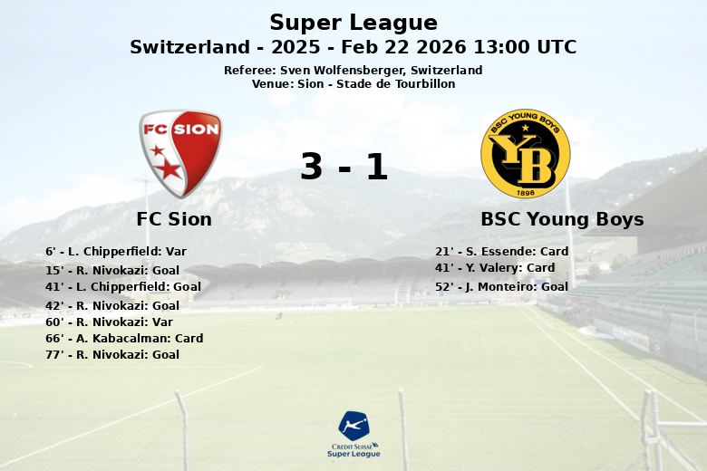 Remplacements dans l’quipe de fc sion: À la 68e minute, L. Chipperfield est entré et J. Lukembila est sorti., À la 68e minute, T. Berdayes est entré et F. Surdez est sorti., À la 84e minute, R. Nivokazi est entré et B. Kololli est sorti., À la 84e minute, Y. Chouaref est entré et A. Llukes est sorti.