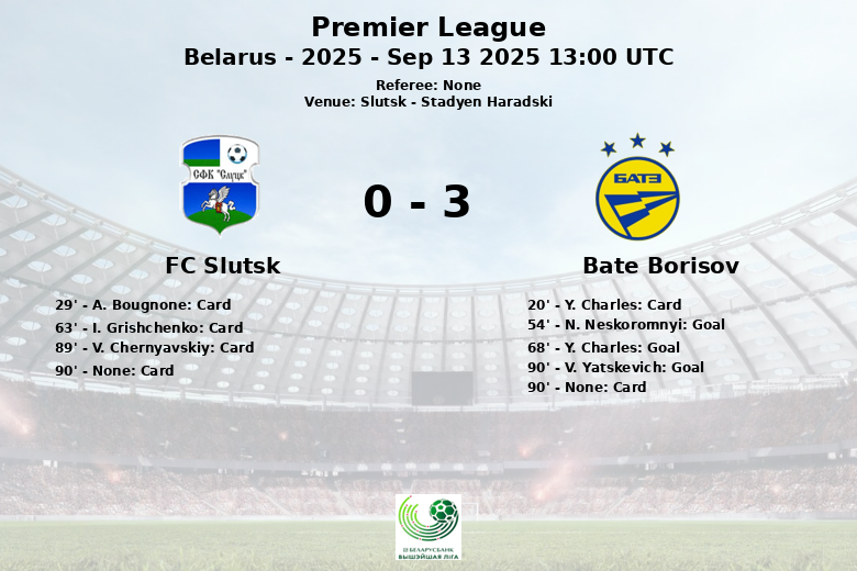 Slutsk, Biélorussie – Dans un match disputé au Stadyen Haradski, le BATE Borisov a remporté la victoire contre le FC Slutsk avec un score final de 3 à 0, lors de la 21e journée de la Premier League biélorusse. Le match, joué le 13 septembre 2025, a été marqué par une intensité notable et plusieurs avertissements.