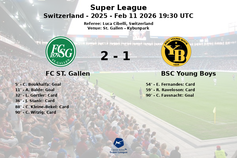 Remplacements dans l’quipe de fc st. gallen: À la 46e minute, J. Stanic est entré et C. Kleine-Bekel est sorti., À la 76e minute, A. Vogt est entré et D. Besio est sorti., À la 89e minute, H. Vandermersch est entré et J. Ruiz est sorti., À la 89e minute, A. Balde est entré et N. Weibel est sorti., À la 90e minute, L. Gortler est entré et M. Stevanovic est sorti.