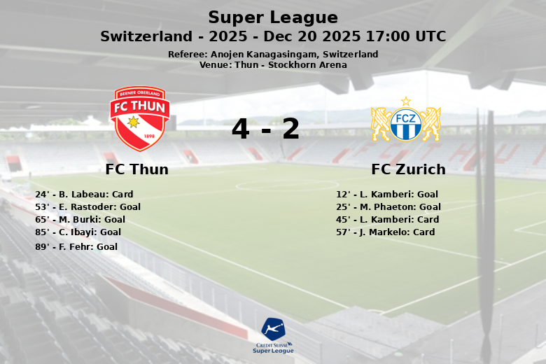 Thoune, Suisse – Dans un match palpitant et riche en rebondissements, le FC Thoune a orchestré une remontée spectaculaire à domicile contre le FC Zurich, se soldant par un score final de 5 à 2. Le match, disputé au Stockhorn Arena et arbitré par Anojen Kanagasingam, dans le cadre de la 19e journée de la Super League 2025, a tenu les supporters en haleine.