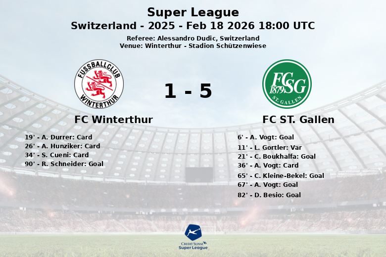 Winterthour a tenté de réagir, mais a été freiné par une défense solide et une attaque implacable de Saint-Gall. Le match a été interrompu par plusieurs cartons jaunes, reflétant l’intensité de la rencontre, avec A. Durrer, A. Hunziker et S. Cueni avertis pour Winterthour et A. Vogt pour Saint-Gall.