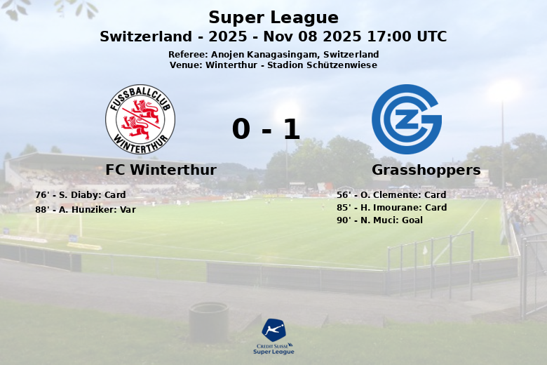 Winterthour, Suisse – Dans un match disputé au Stadion Schützenwiese, Grasshoppers a arraché une victoire contre le FC Winterthour grâce à un but à la dernière minute de N. Muci. Le match, comptant pour la 13e journée de la Super League suisse, a été une rencontre serrée avec une légère domination de la possession pour Winterthour (51%), mais avec une initiative offensive plus importante de Grasshoppers (17 tirs au total contre 11).
