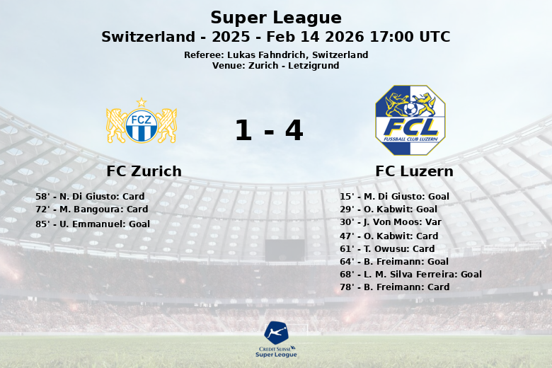 Zurich, Suisse – Dans une rencontre animée qui s’est déroulée au Letzigrund, le FC Lucerne a vaincu de manière décisive le FC Zurich. Le match, comptant pour la 25e journée de la Super League suisse, a été caractérisé par un rythme élevé et de nombreuses occasions de marquer.