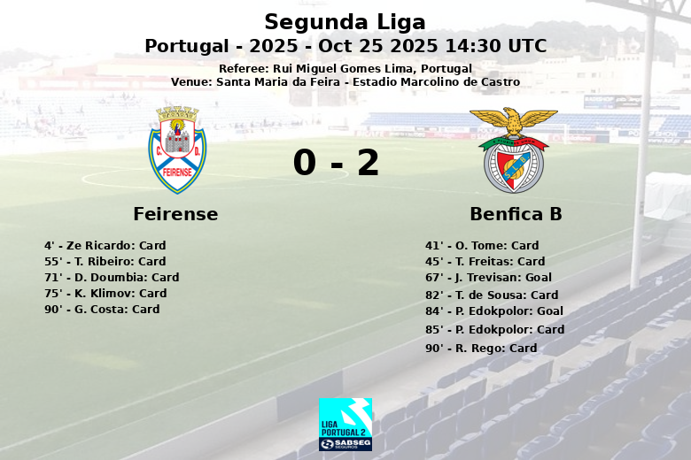 En seconde période, le match est resté tout aussi disputé. Benfica B a réussi à ouvrir le score à la 67e minute grâce à un but de J. Trevisan, sur une passe décisive de R. Rego. Feirense a tenté de réagir, mais ses efforts ont été contrecarrés par la défense de Benfica B et plusieurs cartons jaunes, notamment T. Ribeiro et D. Doumbia. La tension est montée vers la fin du match, avec davantage d’avertissements pour les deux équipes. Finalement, P. Edokpolor de Benfica B a creusé l’écart à la 84e minute, scellant la victoire pour son équipe. Edokpolor lui-même recevra un carton jaune une minute plus tard. Le match s’est terminé avec d’autres cartons jaunes pour R. Rego de Benfica B et G. Costa de Feirense.