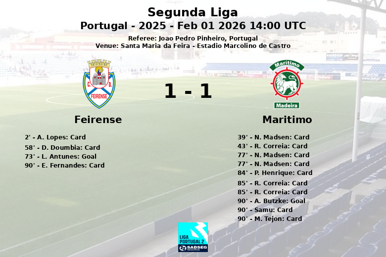 Feirense a réussi à ouvrir le score à la 73e minute grâce à un but de L. Antunes. Cependant, la joie locale fut éphémère. Marítimo, malgré le fait de jouer en infériorité numérique après l’expulsion de N. Madsen à la 77e minute, a trouvé l’égalisation à la 90e minute avec un but de A. Butzke, scellant ainsi un match nul douloureux.