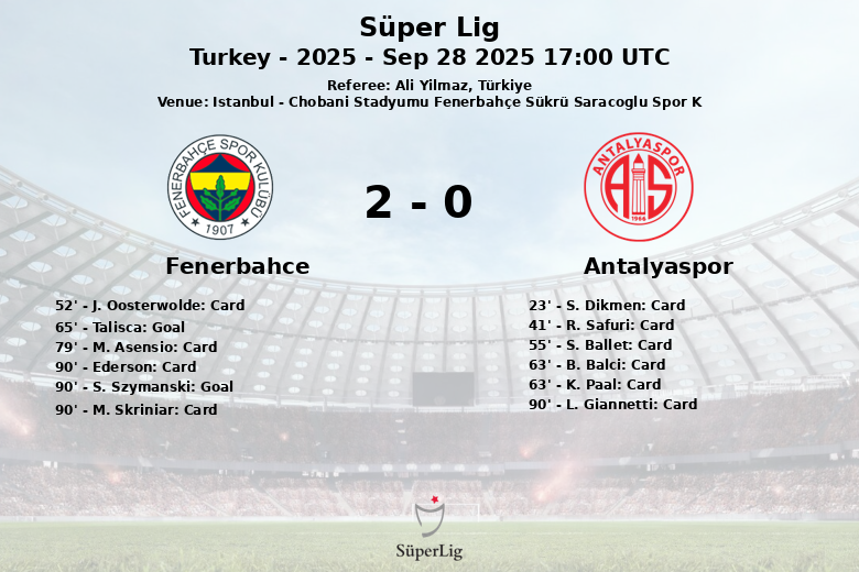 Istanbul, Turquie – Dans un match disputé au Chobani Stadyumu Fenerbahçe Sükrü Saracoglu Spor K, Fenerbahce a battu Antalyaspor avec un score final de 2-0 lors de la 7ème journée de la Süper Lig. Le match, arbitré par Ali Yilmaz, a été marqué par un nombre élevé de cartons jaunes, six pour Antalyaspor et trois pour Fenerbahce.