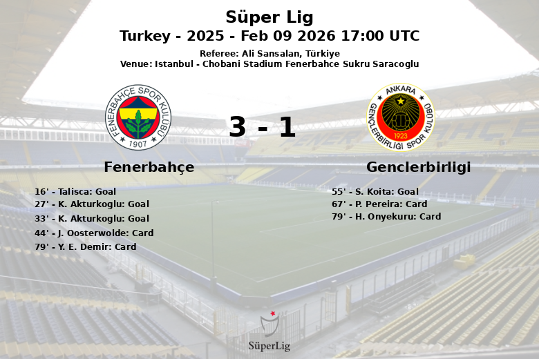 Genclerbirligi, malgré seulement 36 % de possession, a tenté de réagir et a réussi à réduire l’écart à la 55e minute grâce à un but de S. Koita. Cependant, la solidité défensive de Fenerbahçe et sa domination au milieu de terrain ont empêché un retournement de situation. Le match a été intense, comme en témoignent les cartons jaunes montrés à J. Oosterwolde et Y. E. Demir pour Fenerbahçe et à P. Pereira et H. Onyekuru pour Genclerbirligi. Fenerbahçe a commis 9 fautes, tandis que Genclerbirligi en a accumulé 12. L’arbitre Ali Sansalan a passé une soirée chargée lors de ce choc passionnant.
