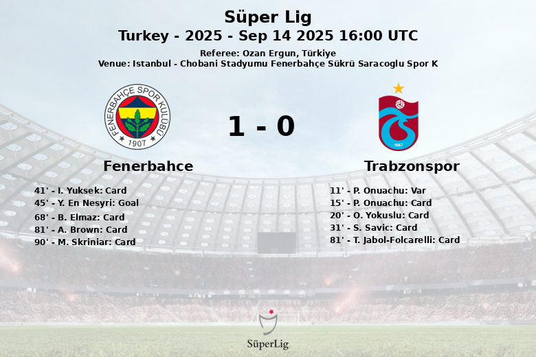 La deuxième mi-temps a continué avec un jeu physique et de nombreuses fautes. B. Elmaz, A. Brown et M. Skriniar de Fenerbahce ont été avertis, tandis que T. Jabol-Folcarelli de Trabzonspor a également reçu un carton jaune. Malgré un net désavantage numérique, Trabzonspor s’est battu avec acharnement mais n’a pas pu surmonter la solide défense de Fenerbahce. Le match s’est terminé par une victoire pour Fenerbahce.