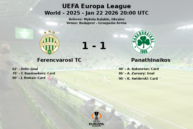 Budapest a été le théâtre d’une rencontre disputée entre Ferencvarosi TC et Panathinaikos, correspondant à l’UEFA Europa League. Le match, qui s’est déroulé au Groupama Arena, s’est soldé par un match nul. Ferencvarosi a pris l’avantage grâce à un penalty transformé par Dele à la 62e minute. Cependant, Panathinaikos a réagi dans les dernières minutes, parvenant à égaliser à la 86e minute grâce à un but de A. Zaroury, servi par D. Calabria.