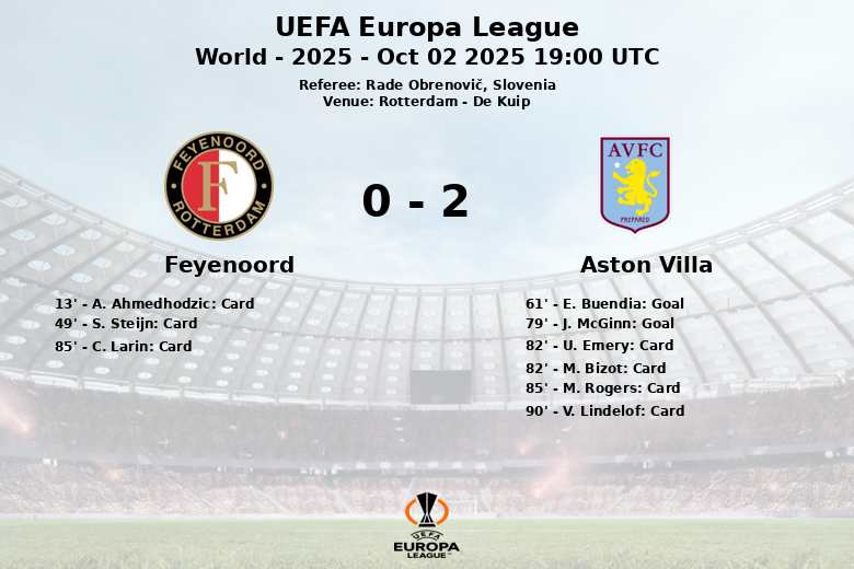 Le match a été interrompu à plusieurs reprises par des fautes, 16 du côté du Feyenoord et 10 du côté d’Aston Villa, et l’intensité s’est traduite par un total de cinq cartons jaunes montrés au Feyenoord et cinq à Aston Villa (dont un à l’entraîneur U. Emery). Malgré les 18 tirs du Feyenoord, seuls 7 ont trouvé le cadre, tandis qu’Aston Villa, avec moins de tirs (6), a fait preuve d’une plus grande efficacité en transformant deux tirs en buts. Les corners ont également favorisé l’équipe locale avec 8 contre 1 pour Aston Villa. Le match a eu lieu le 2 octobre 2025.