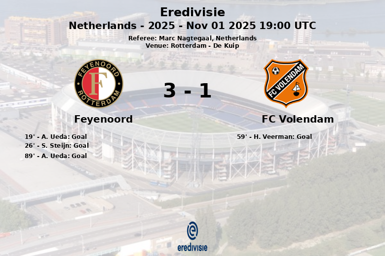 Le match s’est ouvert tôt, avec un but de A. Ueda à la 19e minute, sur une passe décisive de G. Read. Peu de temps après, à la 26e minute, S. Steijn a creusé l’écart pour Feyenoord. Volendam a réussi à réduire le score à la 59e minute grâce à un but de H. Veerman, sur une passe décisive de A. Oehlers. Cependant, Feyenoord a scellé sa victoire à la 89e minute avec un autre but de A. Ueda, cette fois sur une passe décisive de Hwang In-Beom, fixant le score final en faveur de l’équipe locale.