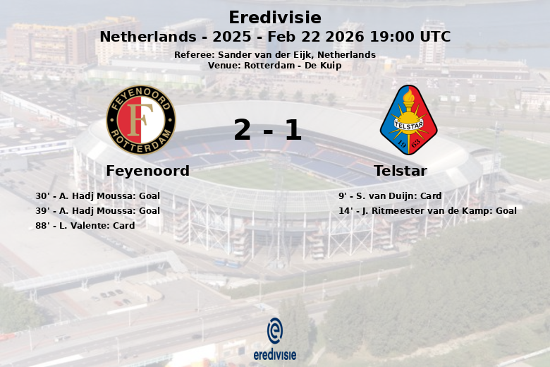 Rotterdam, le 22 février 2026 – Feyenoord a battu Telstar lors d’un match correspondant à la 24e journée de l’Eredivisie, disputé au stade De Kuip. Le match, arbitré par Sander van der Eijk, s’est avéré plus disputé que le score final ne le laisse supposer.