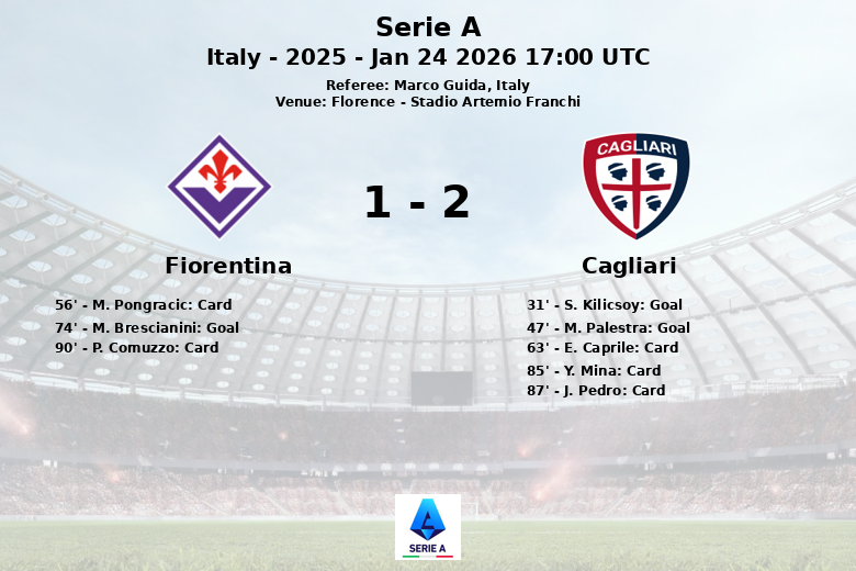 Le premier but du match est arrivé à la 31e minute, marqué par S. Kilicsoy pour Cagliari, sur une passe décisive de M. Palestra. Cagliari a accentué son avance au début de la seconde période, à la 47e minute, avec un but de M. Palestra, sur une passe décisive de S. Esposito. Il semblait que Cagliari se dirigeait vers une victoire surprenante, mais la Fiorentina n’a pas abandonné. L’équipe locale, qui a tenté 15 tirs (3 cadrés), a finalement été récompensée à la 74e minute, avec un but de M. Brescianini, sur une passe décisive de Dodo.